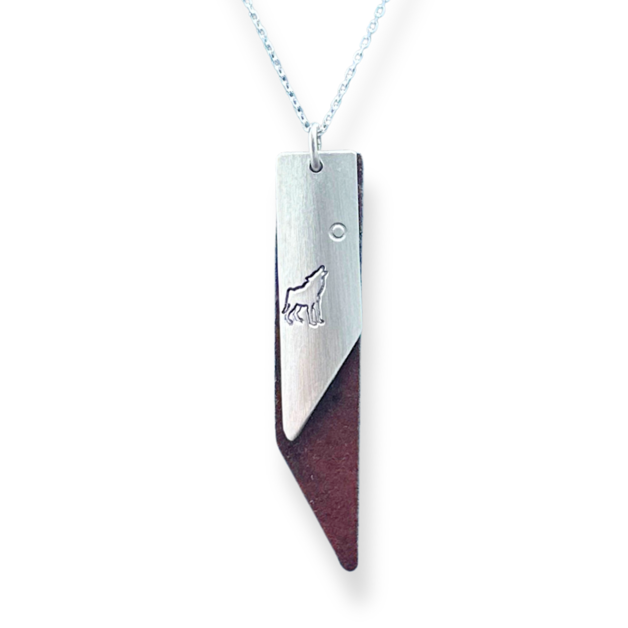 This necklace features a 3.5 cm x 1 cm brushed pewter wedge resting on a flat 5 x 1 cm recycled antique tin wedge and is suspended on a 18" sterling silver cable chain.