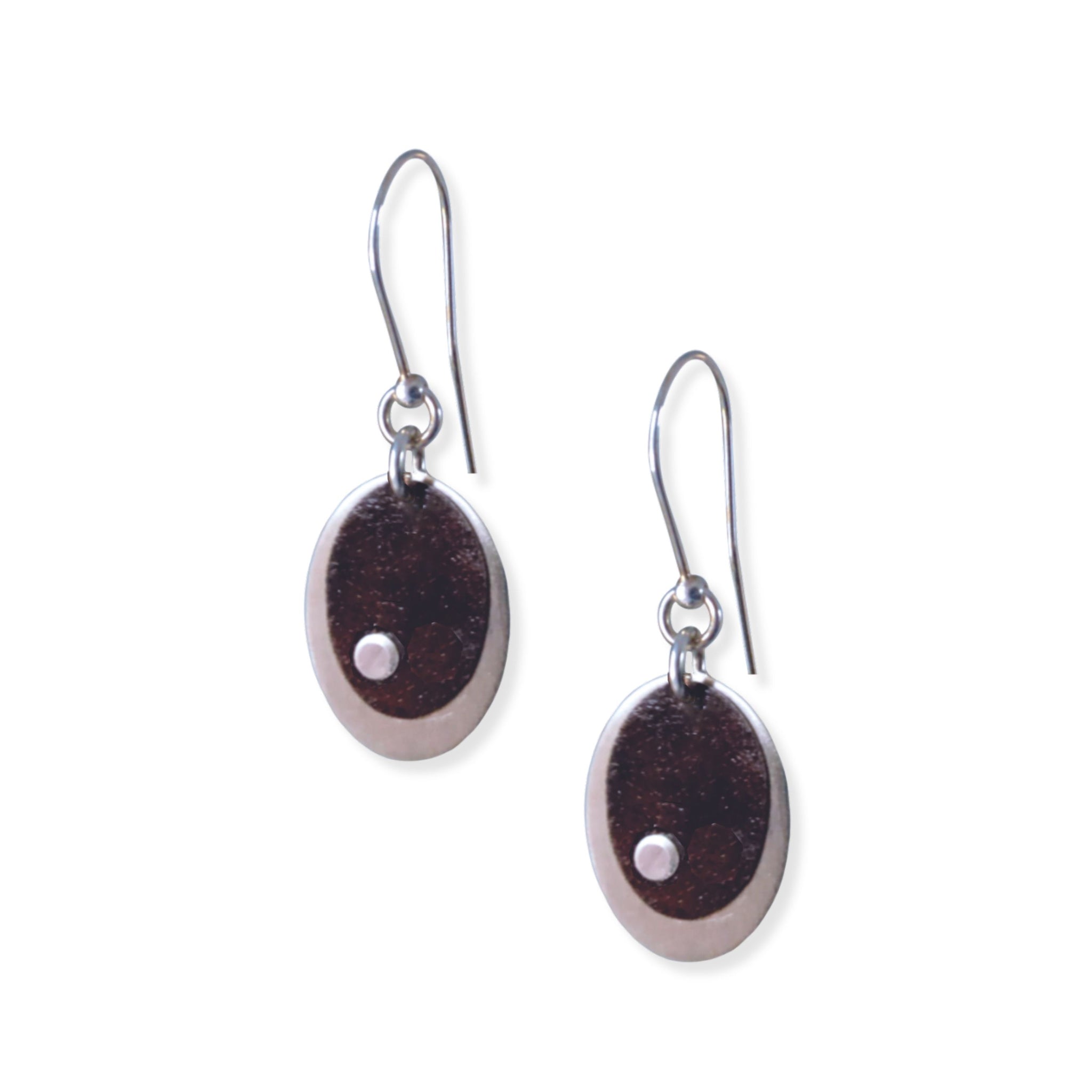 These earrings each feature a 1.8 x 1.2 cm antique tin oval disk on a 2.2 x 1.7 cm brushed pewter oval disk. The pewter pops with small pewter accent rivet and the bright pewter disk in the background! These are suspended from sterling silver french ear-wires that feature a silver ball and small silver ring. Total length of Vintage Olivia Earrings is 4.3 cm.