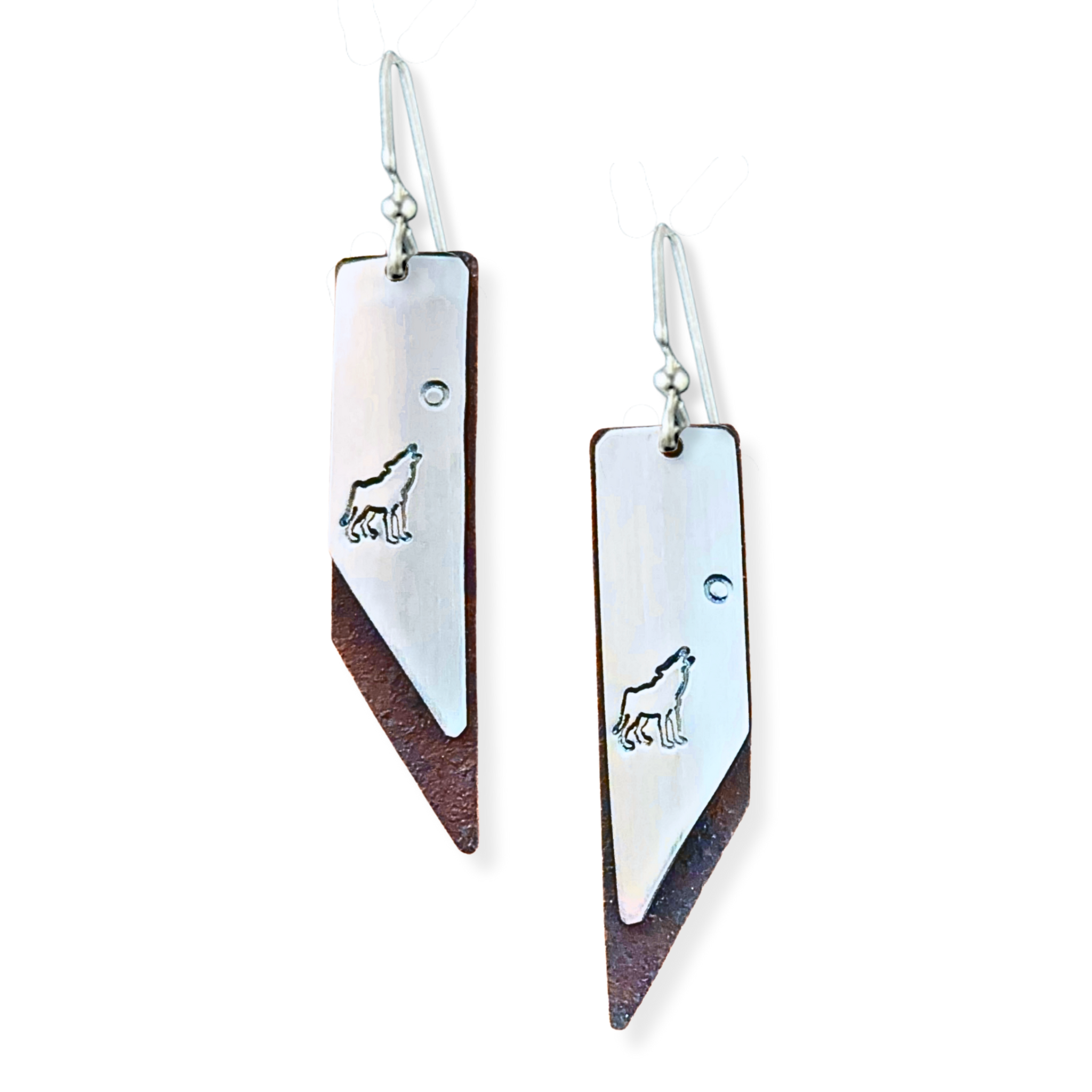 These earrings features a 3.5 cm x 1 cm brushed pewter wedge resting on a flat 4.2 x 1 cm recycled antique tin wedge and are suspended on angular sterling silver ear-wires.