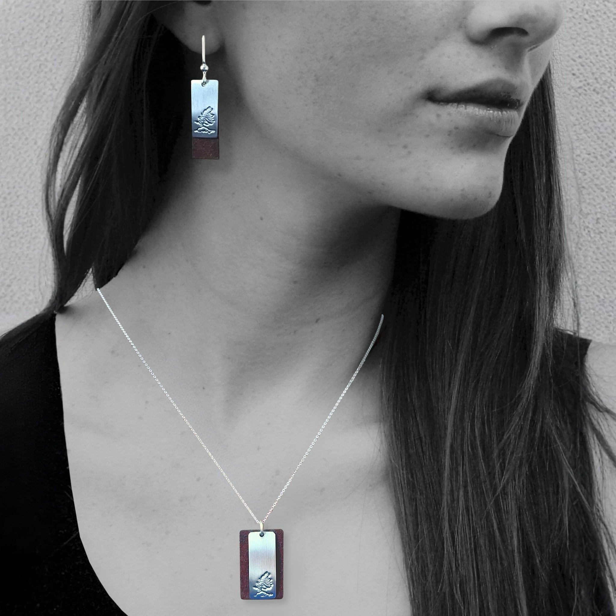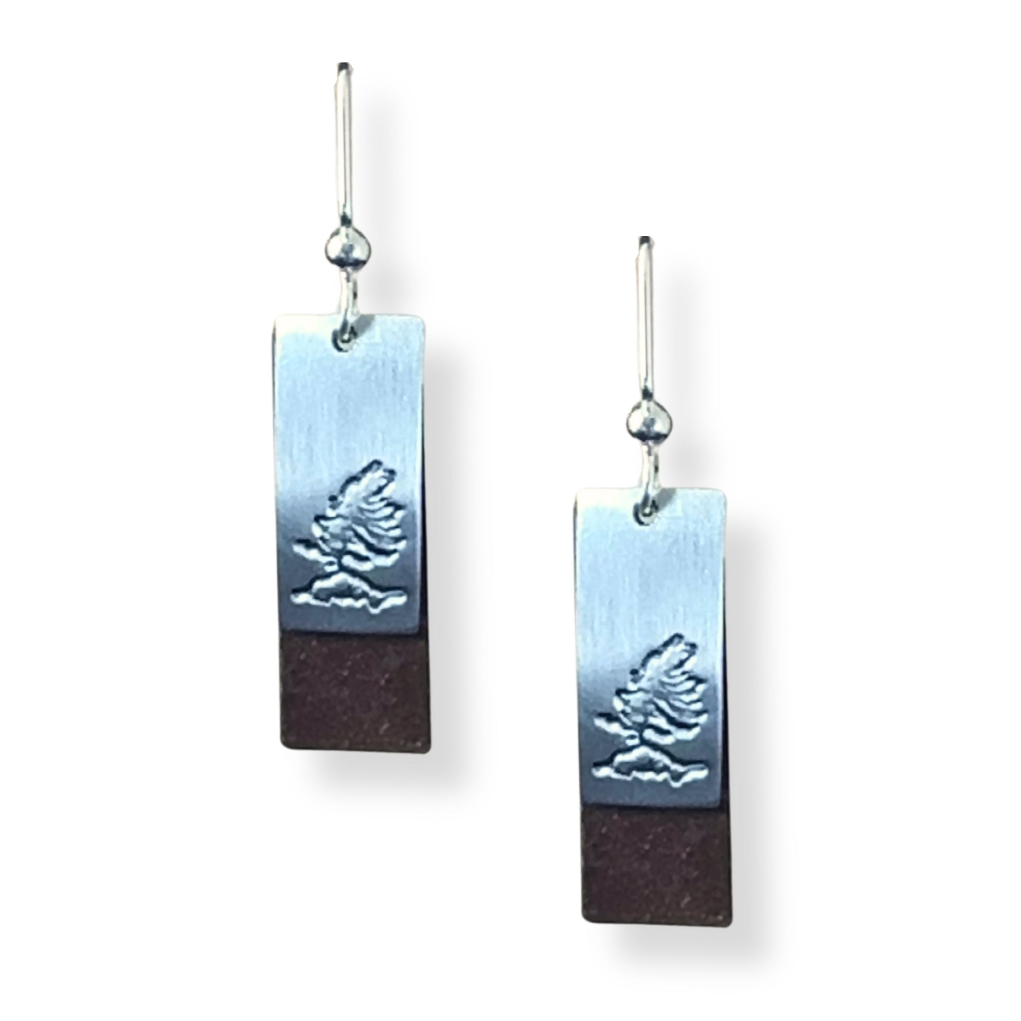 The Ella Earrings combine matte pewter with warm antique tin in a simple rectangular design. Imprinted symbols add a layer of personal meaning, turning each clean line and sharp angle into a quietly expressive, wearable art piece.